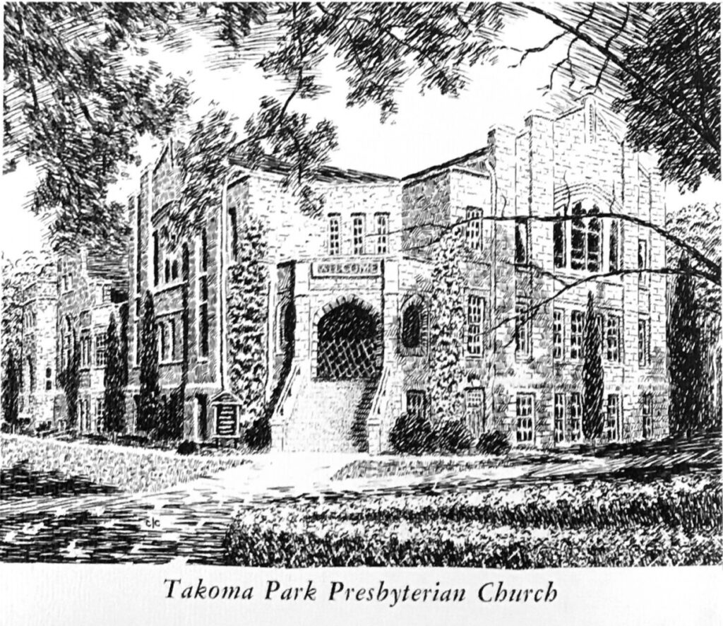Standing at the southeast corner of Maple Avenue and Tulip Avenue, the Takoma Park Presbyterian Church traces its roots to the earliest days of Takoma Park. With the first houses erected and occupied starting in 1884 by 1886 Bible study classes began in various private homes. Soon a regular Sunday school was organized and in the spring of 1888 took place in a tent on Tulip near Maple, moving to the second floor of Birch’s general store on Cedar Street (near the current Metro station) in colder months. Local ministers began holding services and prayer meetings for adults in the tent on Sunday afternoons and evenings.