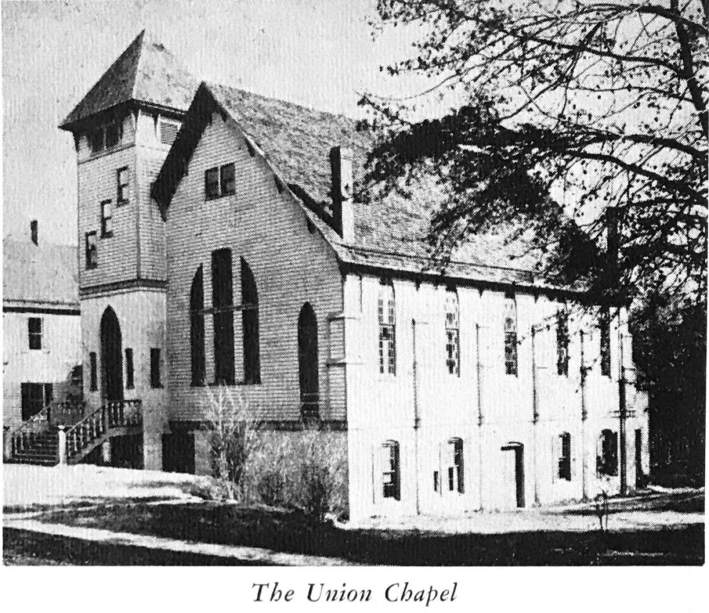 In 1888 residents began organizing for a more formal and permanent arrangement. In September a Union Chapel Association was formed, BF Gilbert donated a lot on Maple Avenue, and fundraising for a building began. By the spring of 1889 the first services were held in Union Chapel, located on the site of what is now the Education Building on Maple Avenue. Read More