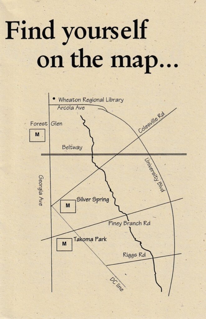Sligo Creek is our most prominent landmark. It begins in Kemp Mill to our north and traces a diagonal path for 9 miles, crossing through Takoma Park before joining the Northwest Branch of the Anacostia River at the edge of Hyattsville.