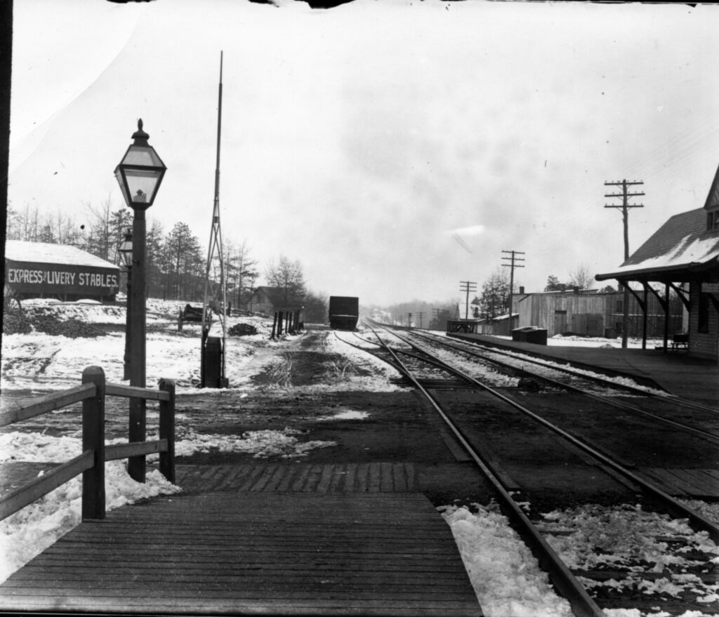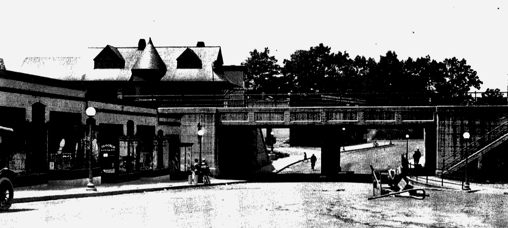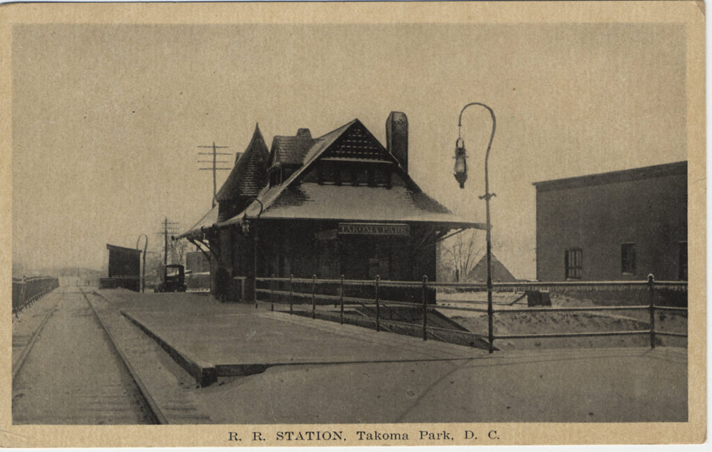 On the evening of August 17, 1967, Takoma Park’s Victorian train station, standing here on the SW corner, burned to the ground, a victim of arson. The iconic landmark was built in 1897 as one of the series of train stations designed by Ephraim Francis Baldwin for the Baltimore and Ohio Railroad. Two Baldwin stations still stand in Kensington and Gaithersburg, giving us some sense of what we lost.