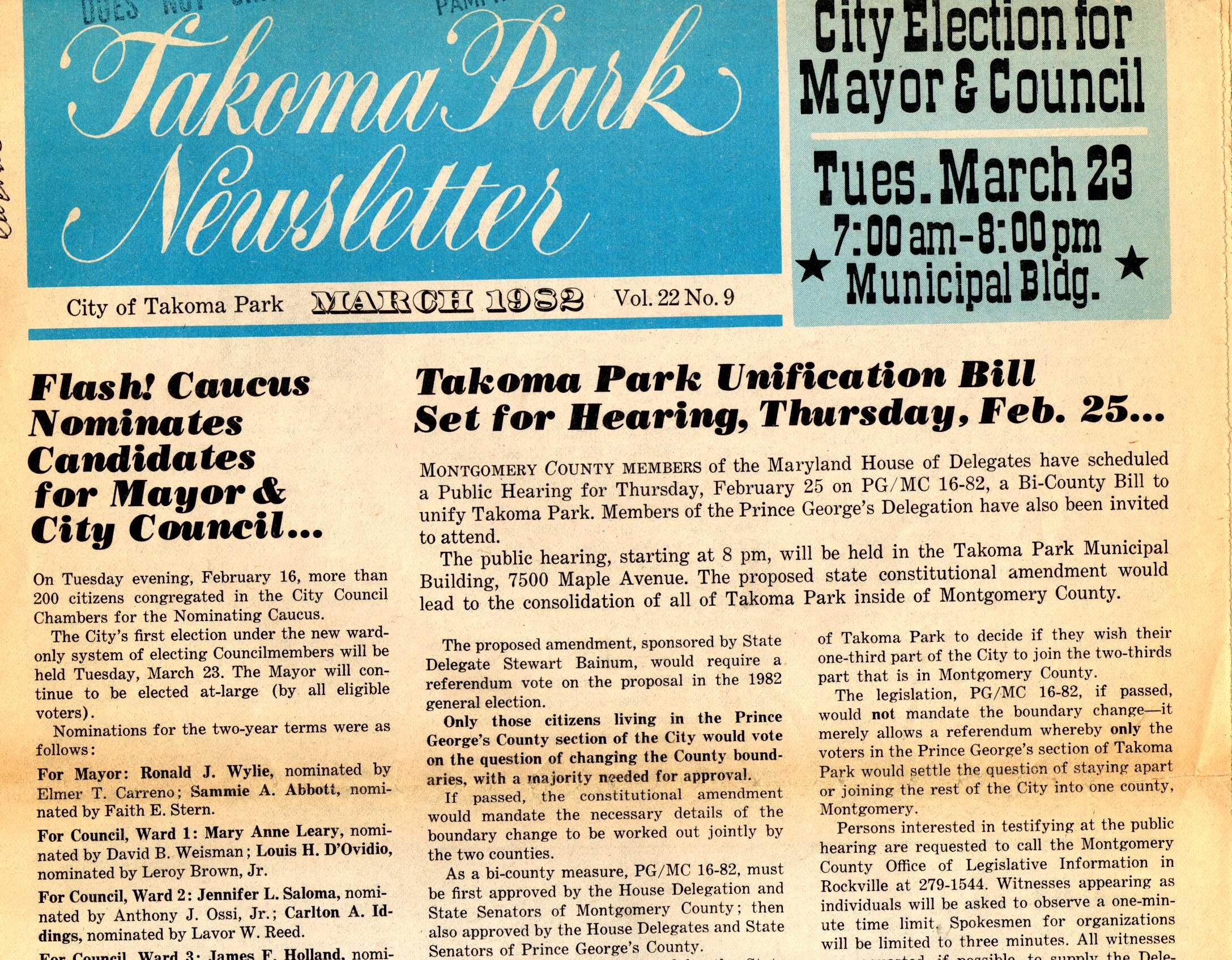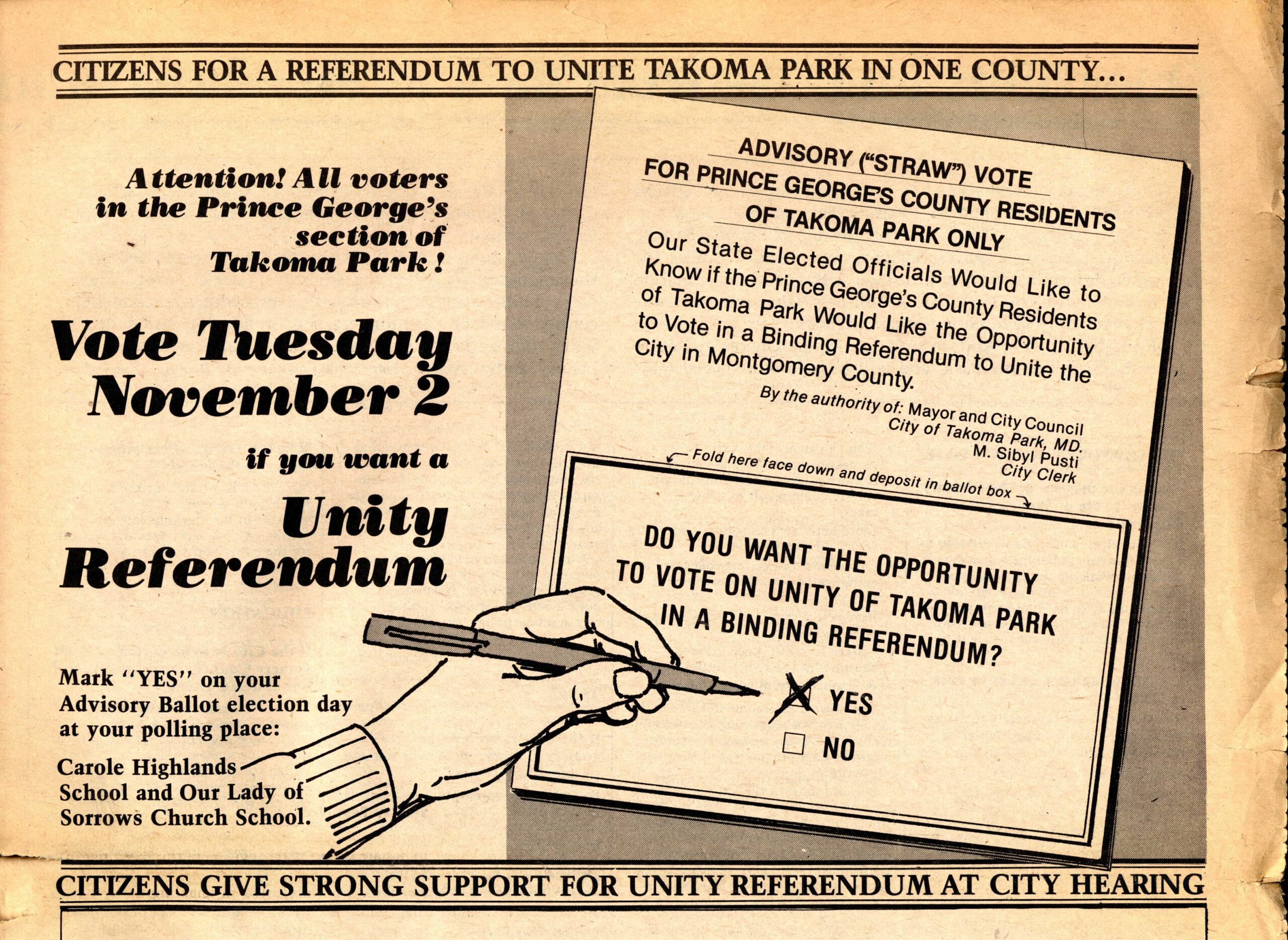 For several years a bill was introduced annually in the legislature to change the county line. Each year the opposition from Prince George’s County’s elected officials doomed the prospects. The City held advisory straw votes in 1982 and 1985 to demonstrate resident support for unification.