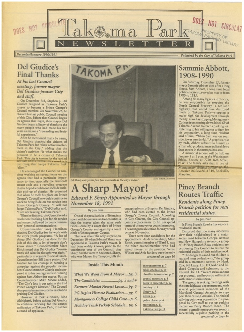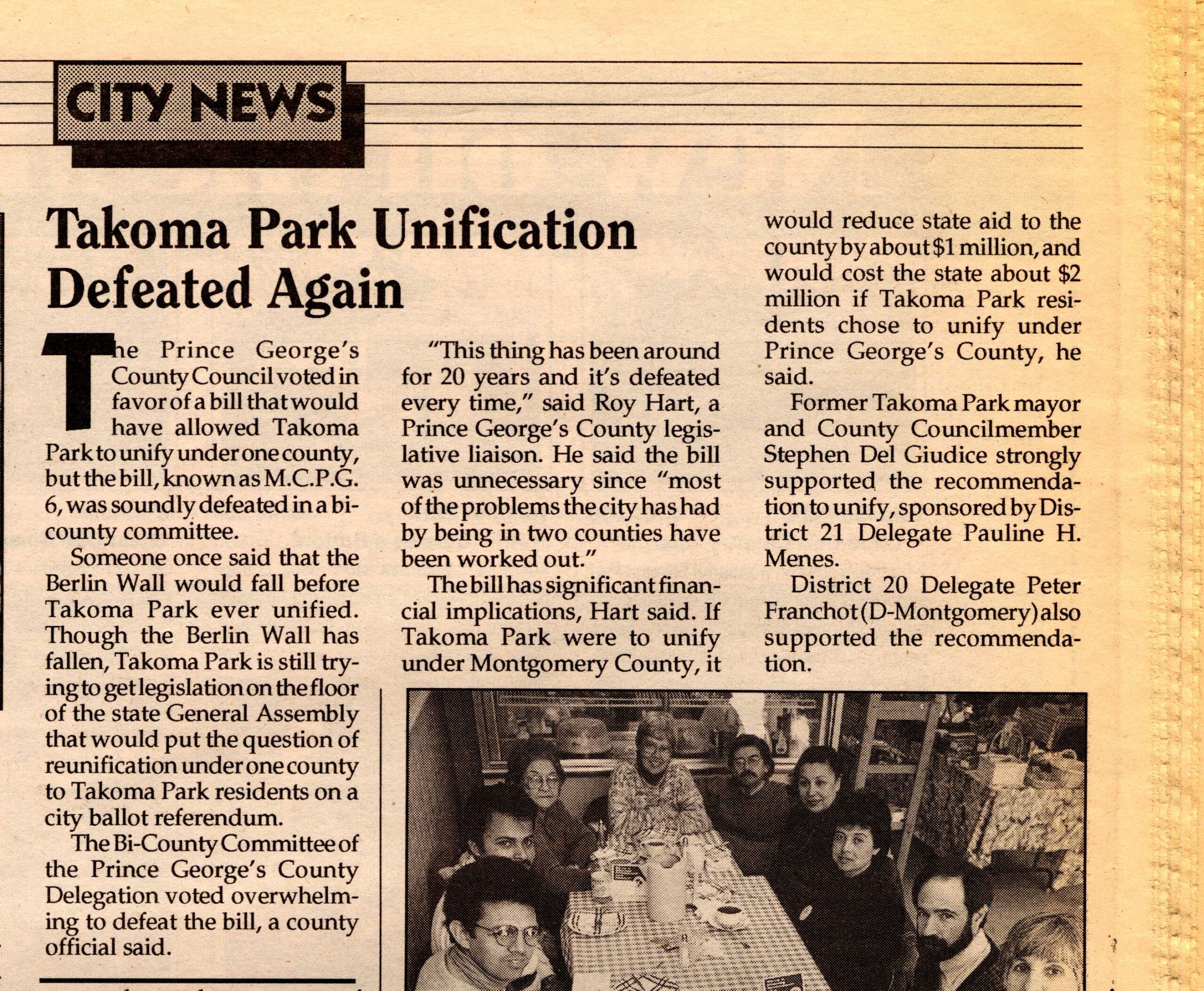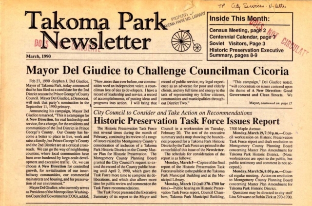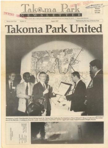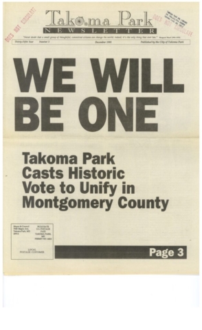 In Montgomery County, Takoma Park resident Peter Franchot was elected to the House of Delegates in the fall of 1987. In the fall of 1990, Takoma Park Mayor Steve Del Giudice was elected to the Prince George’s County Council and soon persuaded his colleagues on the Council to reverse their long-standing opposition and support unification.