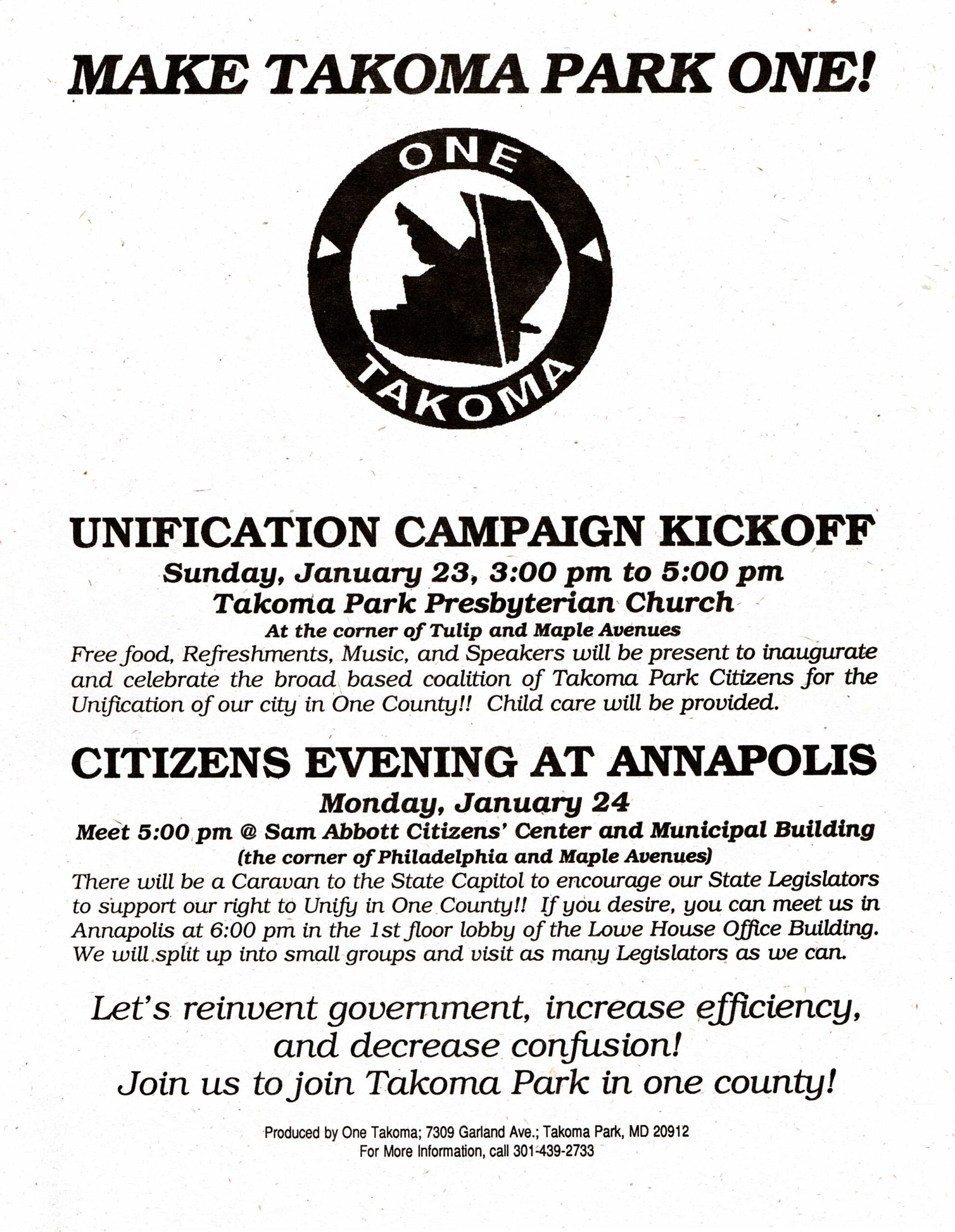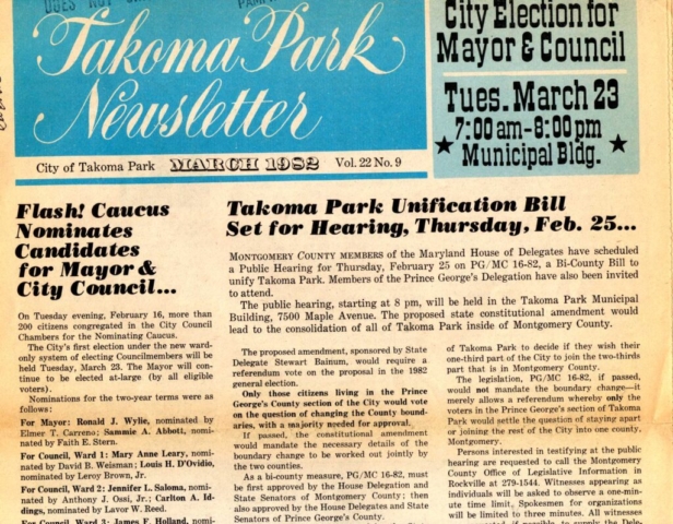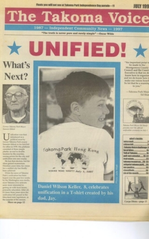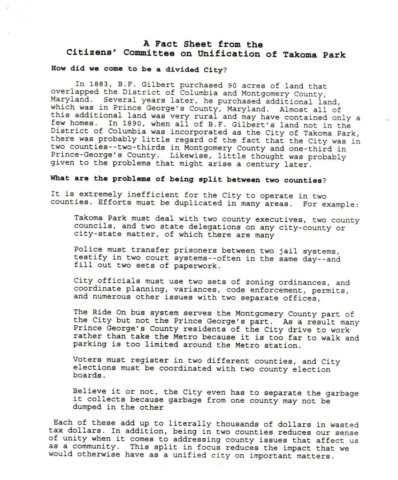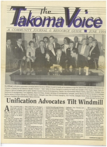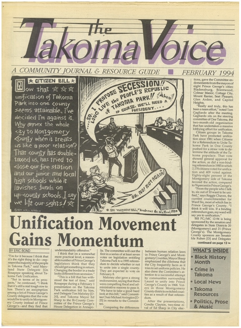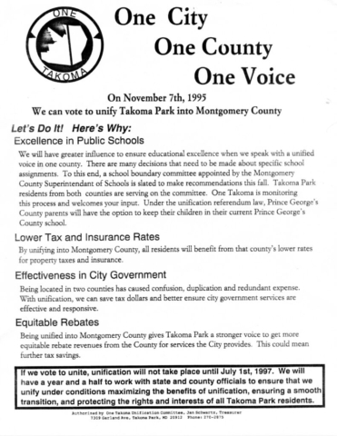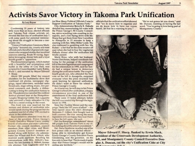 Both the Takoma Park City Newsletter and the Takoma Voice extensively covered the story of unification efforts in from the late 1970s through 1997. Copies of both publications are available in the Historic Takoma Reading Room. At this time the papers have not been indexed.