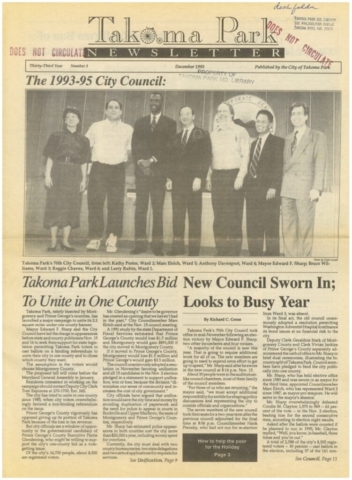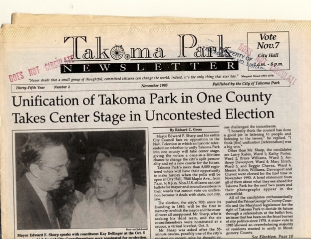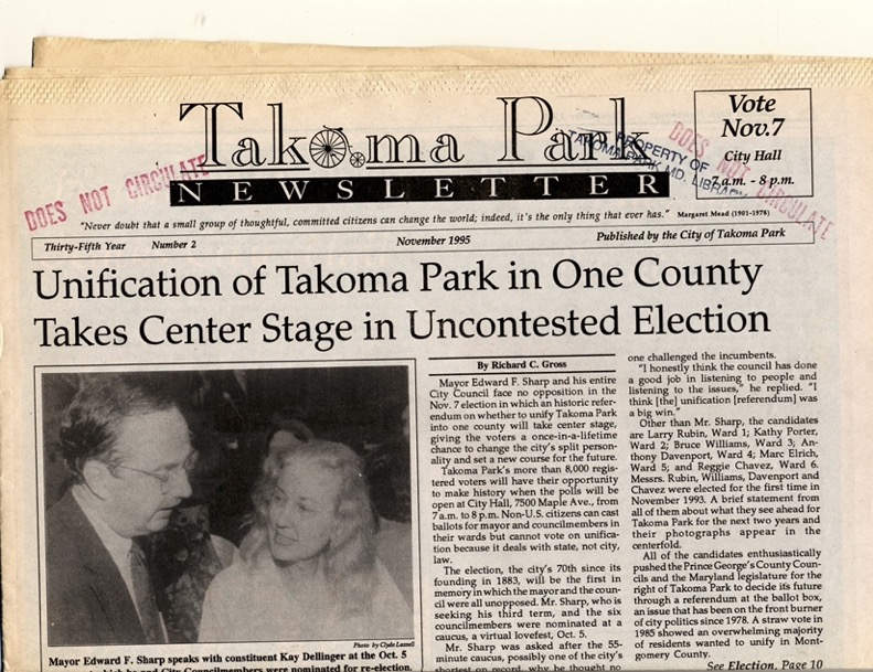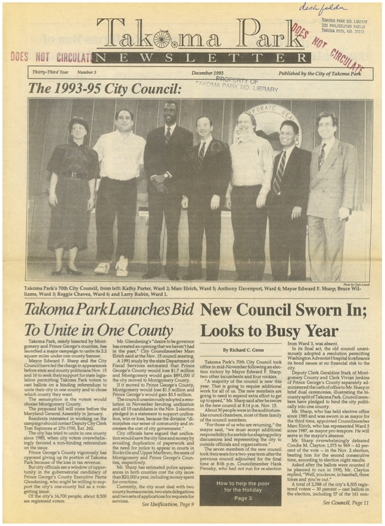 By 1993 Mayor Ed Sharp and members of the City Council such as Kathy Porter and Bruce Williams (both of whom went on to become mayors of Takoma Park) began working closely with citizen activists. This group included Jan Schwartz, Tom Gagliardo, Norm Gleichman, Marie Ritzo, Sherry and Ed Mahon, and many, many others (nearly all from the Prince George’s side of the city and nearly all principally concerned about school issues) under the banner of One Takoma. City Manager Bev Habada had deep roots in Prince George’s County municipal government and worked her connections. It was another unsuccessful year but the campaign continued. The newly elected Mayor and Council began their terms with a renewed effort in November 1993.
