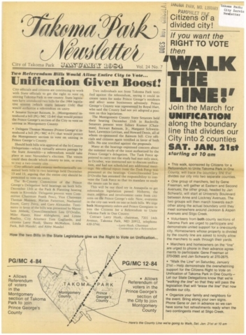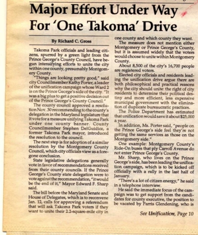 Tapping into growing community interest to unify into one county, mayoral candidate Sam Abbott made unification a central part of his successful 1980 campaign. Thus began a nearly two-decade effort by citizen activists and city leaders. Unification required a change in state law to change the boundaries of the two counties. From a practical standpoint, legislative approval required the support of both the Montgomery County and Prince George’s County delegations to the House of Delegates and the State Senate. The Montgomery County delegation was sympathetic and supportive, though none chose to make it a priority. In Prince George’s County the County Executive, the County Council, and the legislative delegation were firmly opposed to redrawing the county line to place all of Takoma Park in Montgomery County. (Unification could have meant moving the Montgomery County portion of Takoma Park into Prince George’s County, but about two-thirds of the city was already in Montgomery County, and citizen activists strongly favored unifying into Montgomery County).