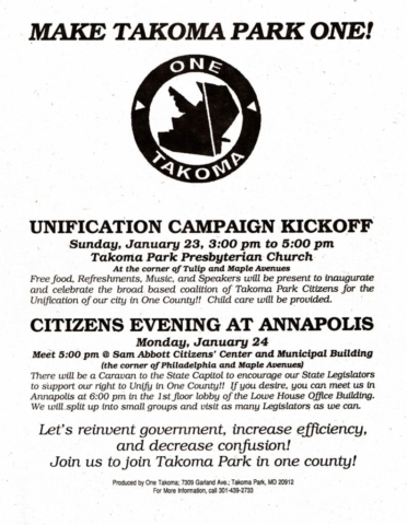 Historic Takoma thanks the many individuals who have taken the time to share their memories and files to make this project possible. We would like to hear from others as well: why did you support (or not support) unification, what activities did you participate in, do you have memorabilia and records? If you’d like to share your experiences, please write to us at archives@historictakoma.org