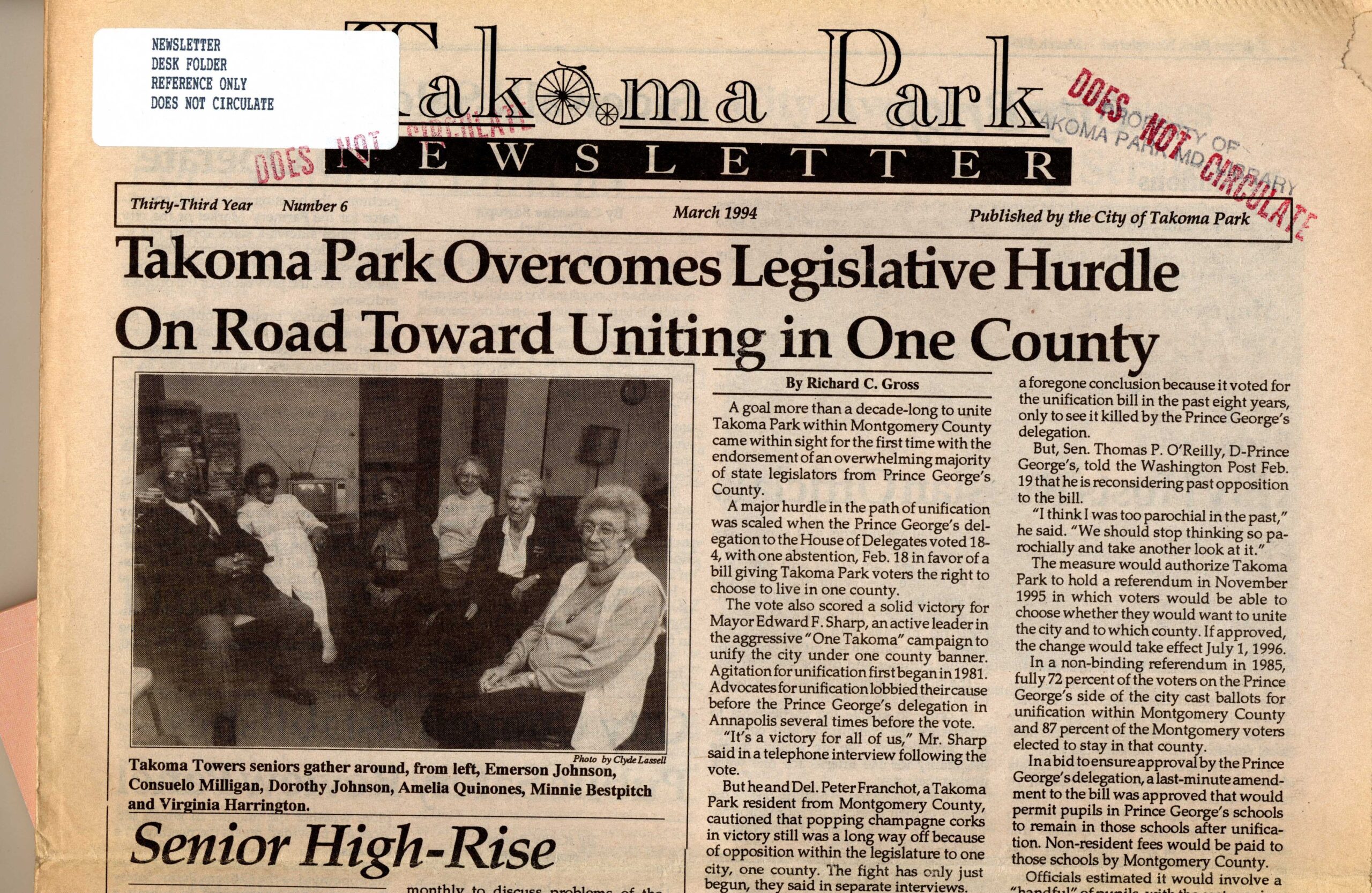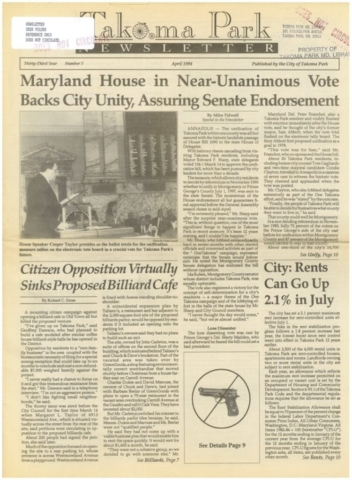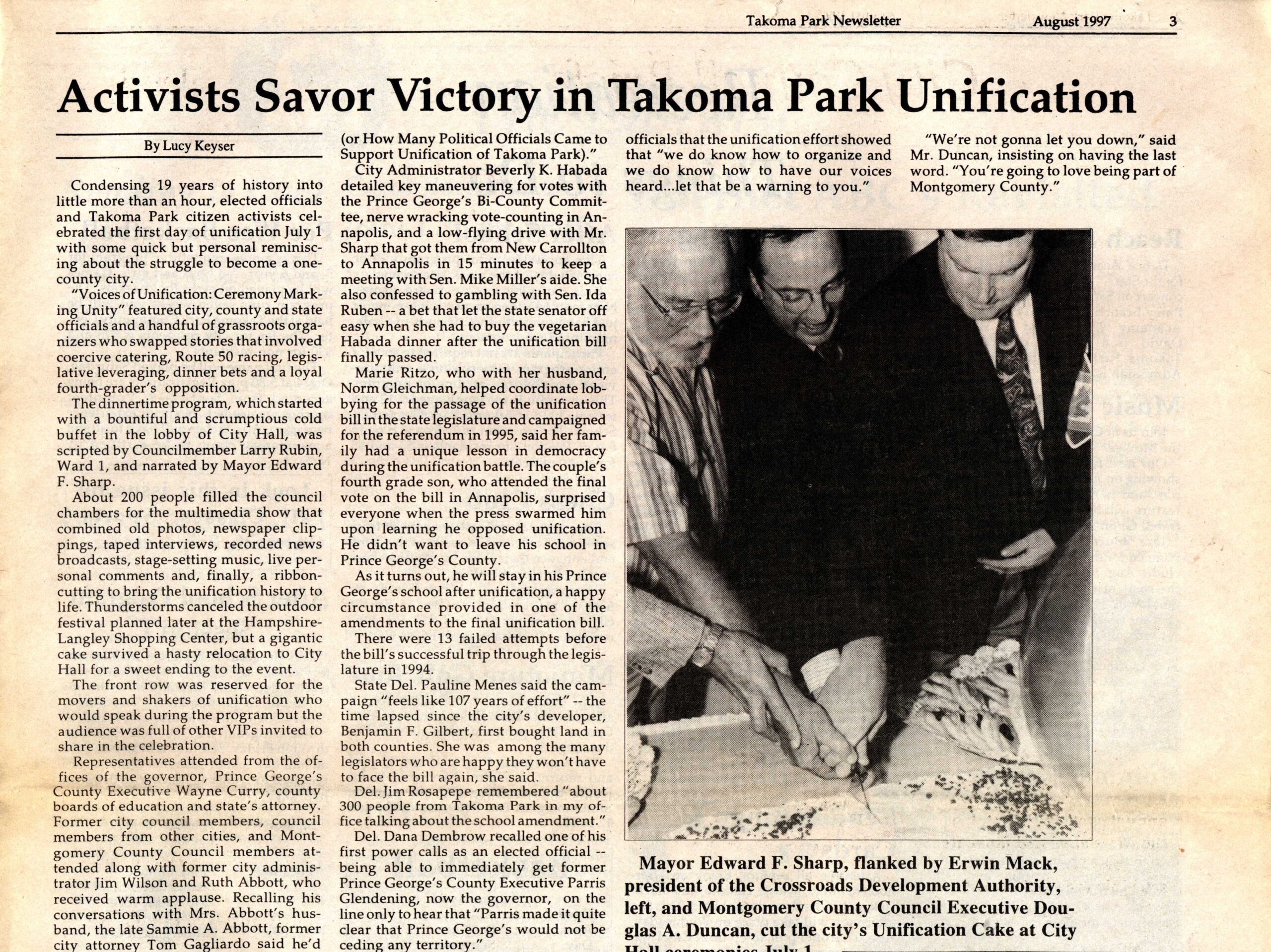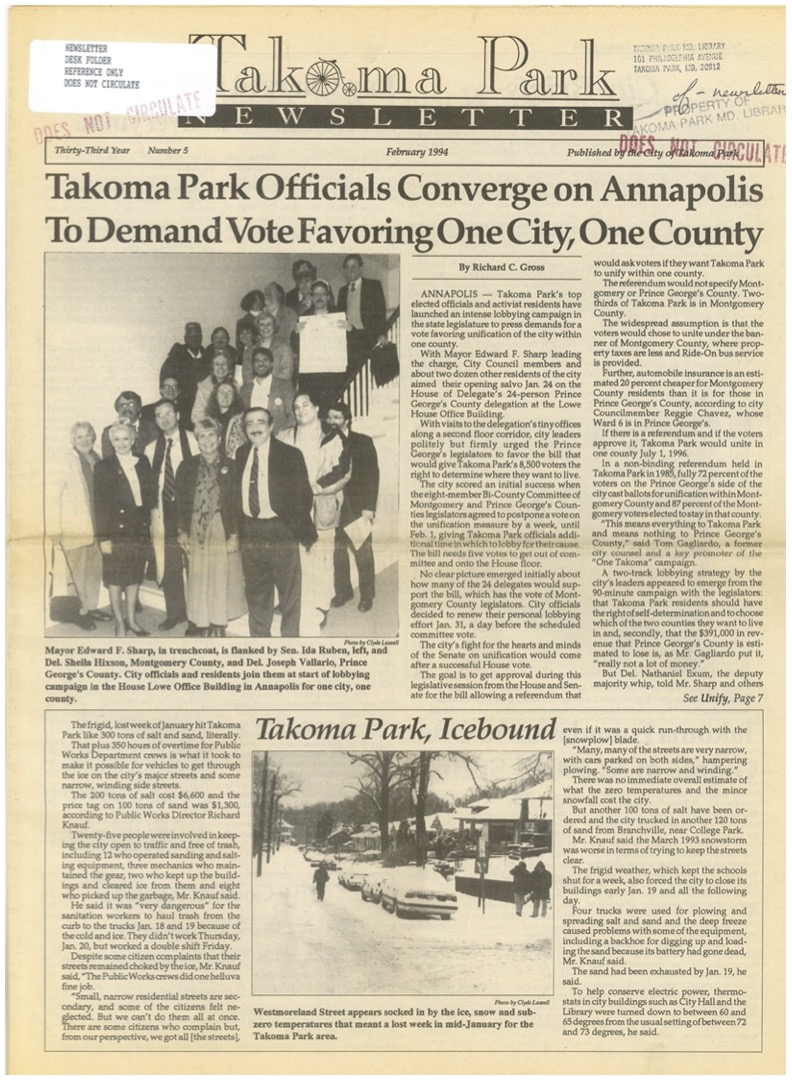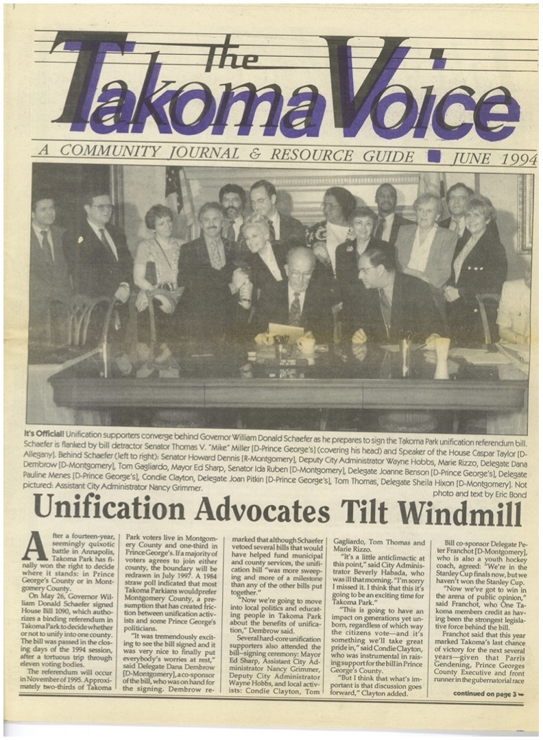 The opportunity for legislative success came in 1994. Long-standing unification opponent Prince George’s County Executive Parris Glendenning announced his candidacy for governor of Maryland and subsequently dropped his opposition to unification. Multiple candidates to replace Glendenning campaigned in the Democratic Party primary that spring, all supporting unification. Looking back in 1997, Ed Sharp attributed the ultimate success of the effort to the fact that Del Guidice had moved out of Takoma Park to Hyattsville and thus gained credibility in Prince George’s County as a now non-Takoma Park resident advocating for unification, and to resident Peter Franchot, who “provided candid and skillful advice on how to get the unification bill passed.”