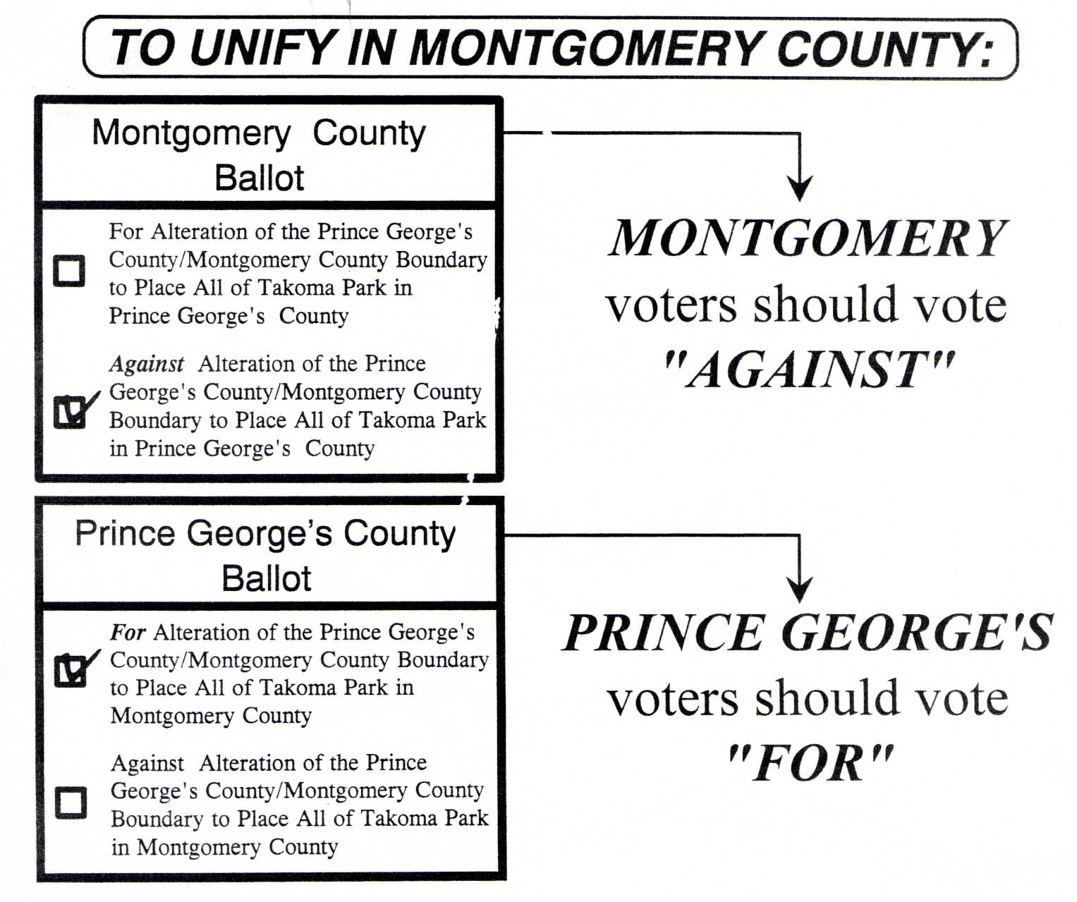 The final hurdle for unification was looming and the voting strategy was counterintuitive to many. Under the terms of the bill establishing the referendum, residents had to not only agree to unify, but also agree on which county. The phrasing of the ballot required Montgomery County voters to vote “no” to not unify into Prince George’s County; Prince George’s voters had to vote “yes” to unify into Montgomery County. Otherwise the results would have nullified each other and unification would have failed. One City – One County activists mobilized to support unification into Montgomery County. None of the members of the Takoma Park City Council faced opposition in the 1995 city election. It was all hands on deck to approve unification into one county.