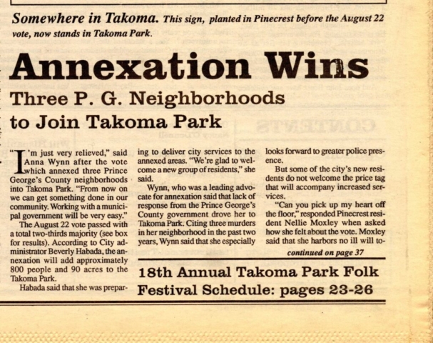 Just outside the corporate boundaries of Takoma Park, and long ignored and underserved by the county, residents of the area saw annexation into Takoma Park, and then eventual unification into Montgomery County, as an opportunity to improve their neighborhoods, although some in Prince George’s County saw this as a last minute land grab by Montgomery County. But with the City Council’s go-ahead, a vote was held among the residents of the area in August 1995. Their approval came days before the deadline for finalizing the November binding referendum. The map of Takoma Park now included the annexed areas – but the city remained in two counties.