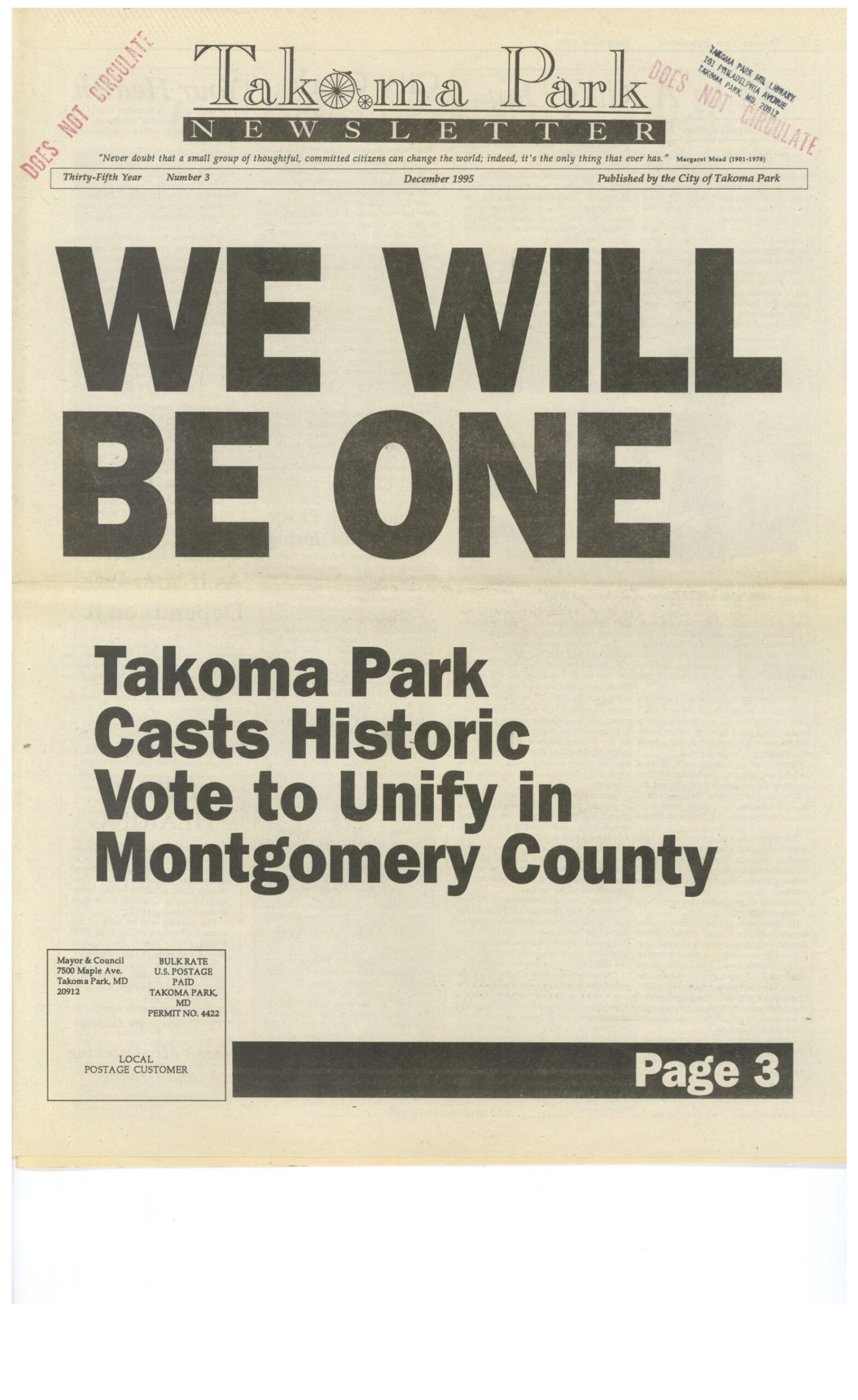 Thus it was that in November 1995 the voters of Takoma Park overwhelmingly voted in favor of unification into Montgomery County (2,382 in favor, 272 opposed). Now it was just a matter of time.