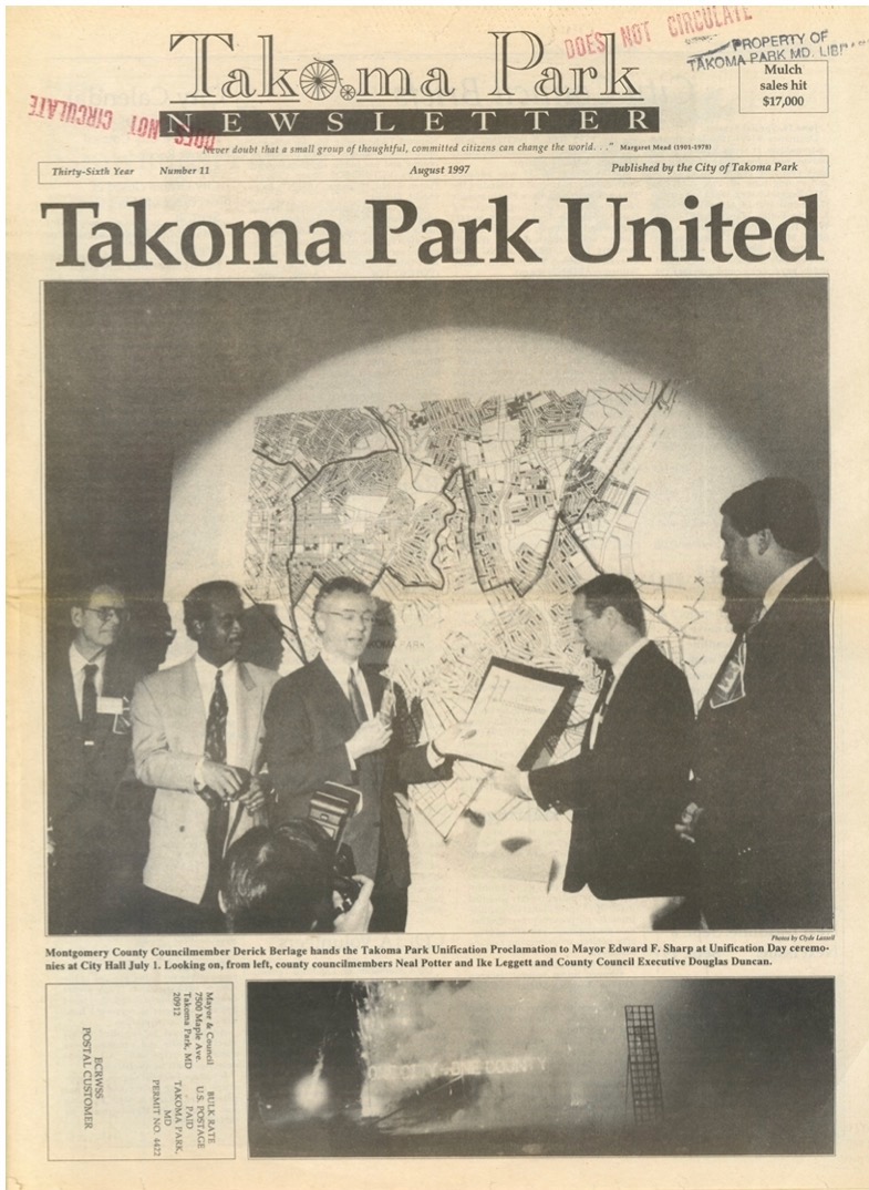 July 1, 2022, marked the 25th anniversary of the unification of the City of Takoma Park into Montgomery County, ending 107 years of divided jurisdiction between Montgomery and Prince George’s Counties and capping a 17-year effort to become One City – One County.