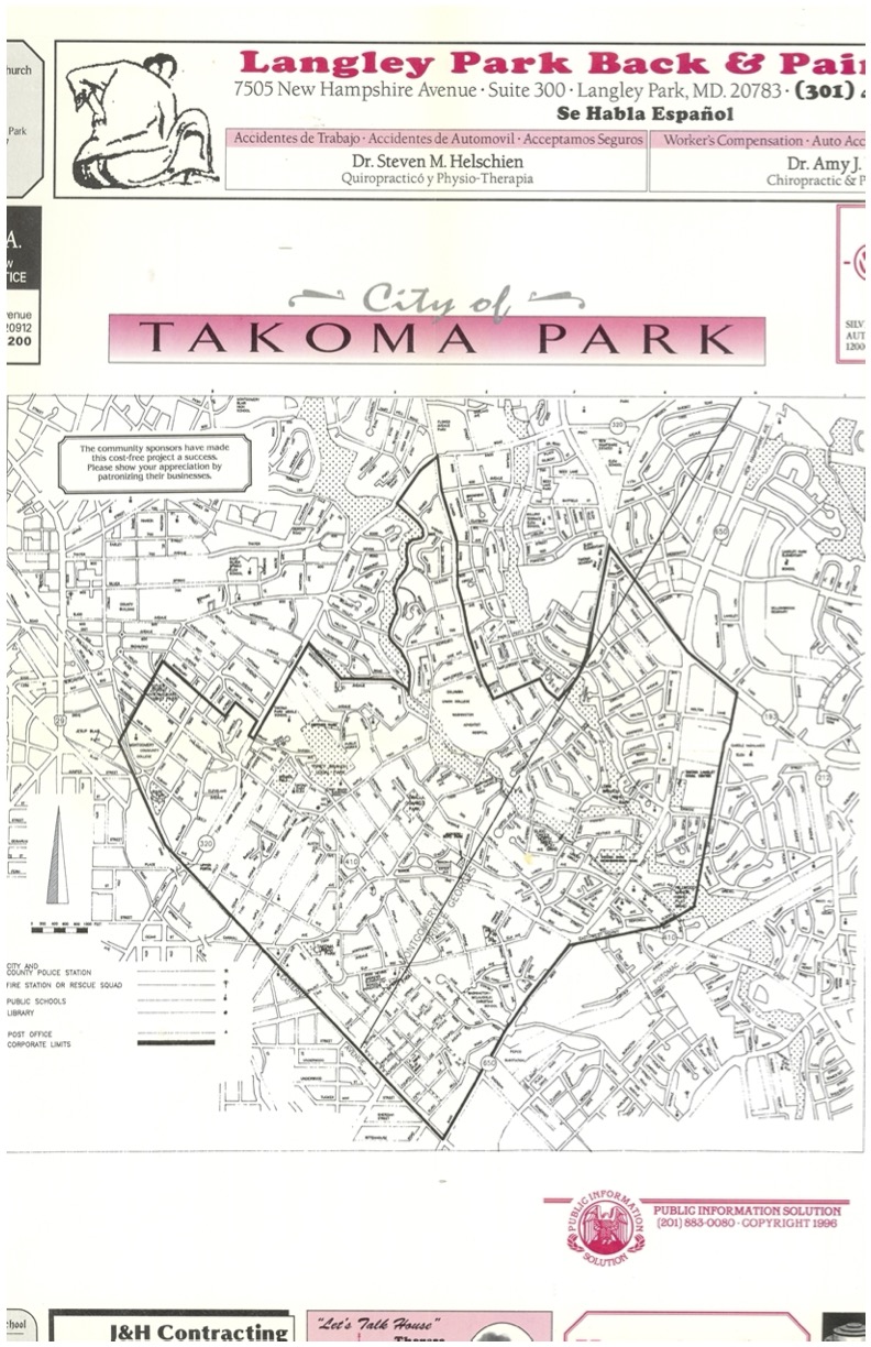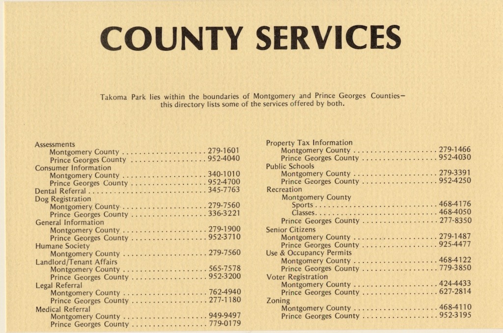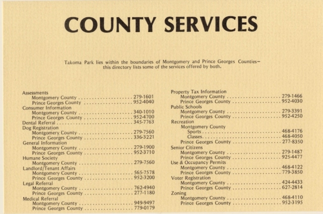 For elected officials and City staff, working in two counties meant tracking and following two sets of county laws for taxes, housing, planning and zoning, licensing and permits, alcohol, animal control, social services, and more. Trash picked up in Montgomery County went to its landfill; trash picked up in Prince George’s County went to its landfill. Takoma Park police carried two sets of ticket books, one for each county, and had to appear in two different courts forty miles apart. City ordinances had to be constructed to comply with both sets of county laws. Everything the City did had to be done twice.