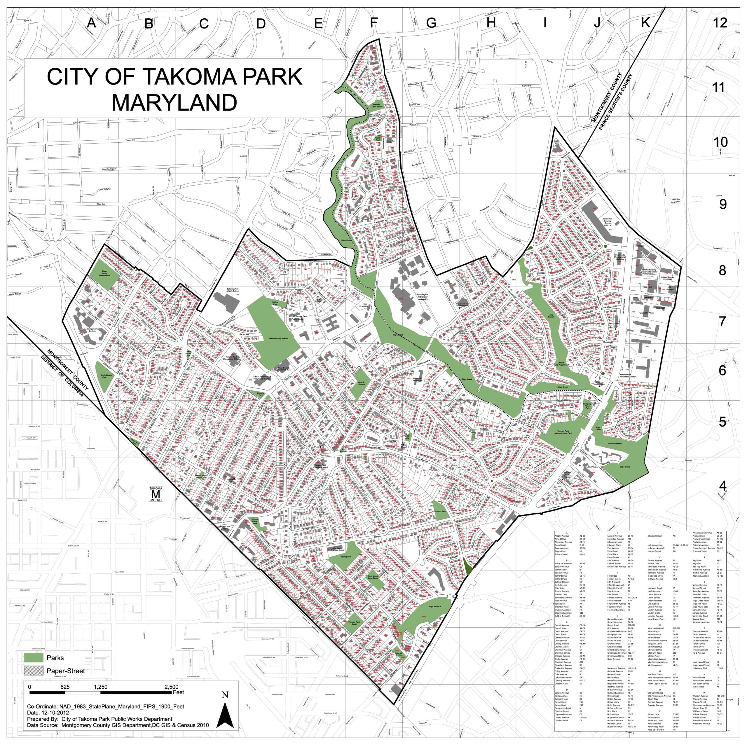 Takoma Park’s divided jurisdiction began when B.F. Gilbert bought his first parcel of land in 1883, subdivided it into streets, blocks, and lots, and called it “Takoma Park.” That initial purchase of 100 acres straddled the B&O Metropolitan Branch railroad line and the District of Columbia-Maryland boundary line. At the time, the portion in Washington was in unincorporated Washington County, DC and the portion in Maryland was in unincorporated Montgomery County. Gilbert continued to purchase land in both Montgomery and Prince George’s Counties. When the State of Maryland chartered the new Town of Takoma Park in 1890, the boundary encompassed lands in both counties.